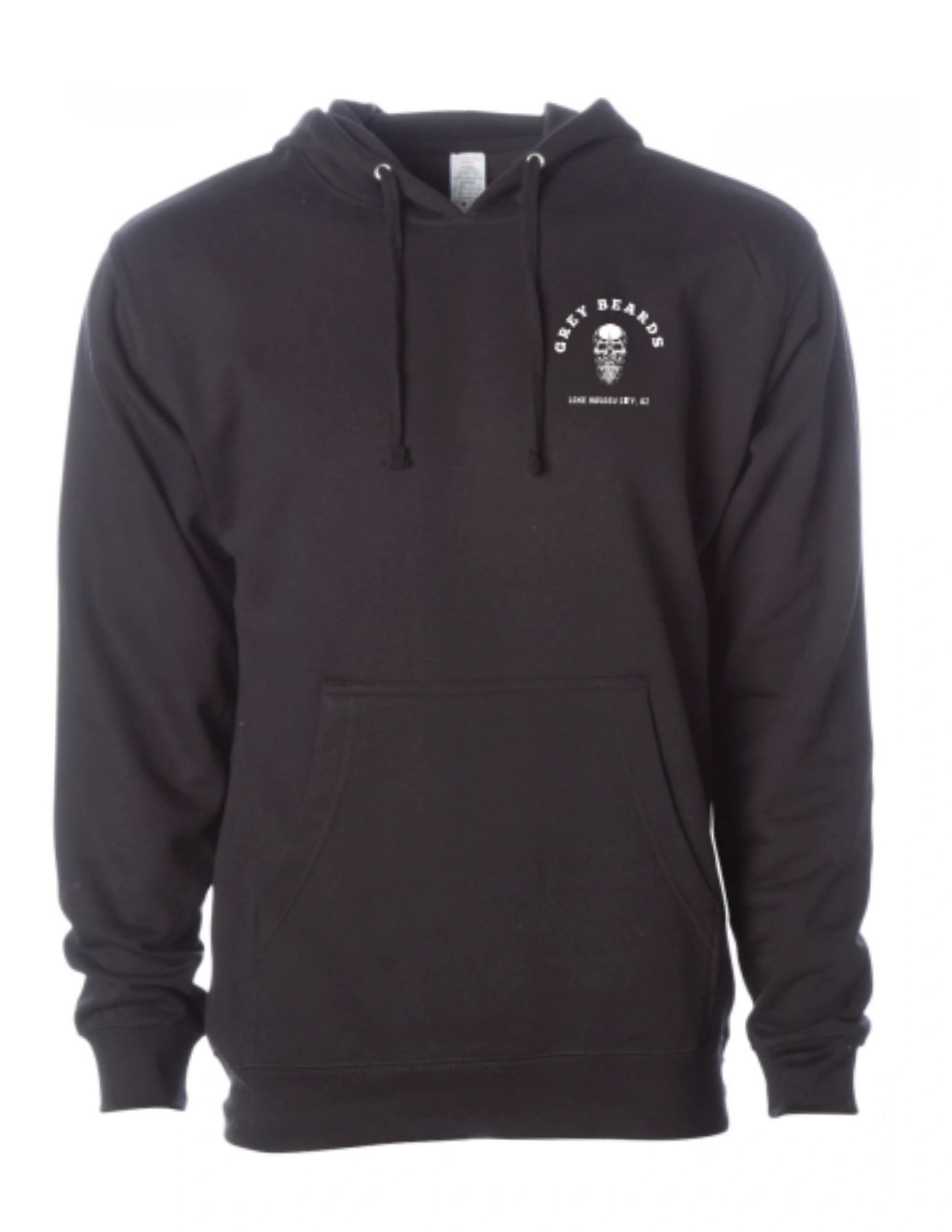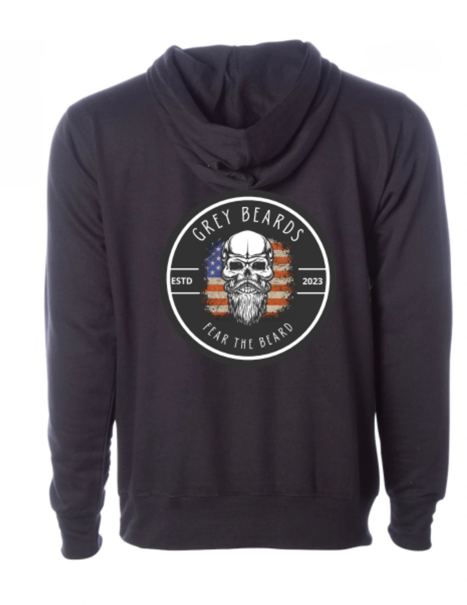 The Fear the Beard American Flag Hoodie is Grey Beards outerwear at its core. The front carries our skull crest with the full-color American flag woven through the beard. The back goes big — the complete “Fear the Beard” emblem, ESTD 2023, with stars and stripes that leave no doubt where you stand. Black pullover hoodie with a front kangaroo pocket, built for layering on cold rides or cool nights. Part of the Grey Beards Patriot Series. Earned not given.