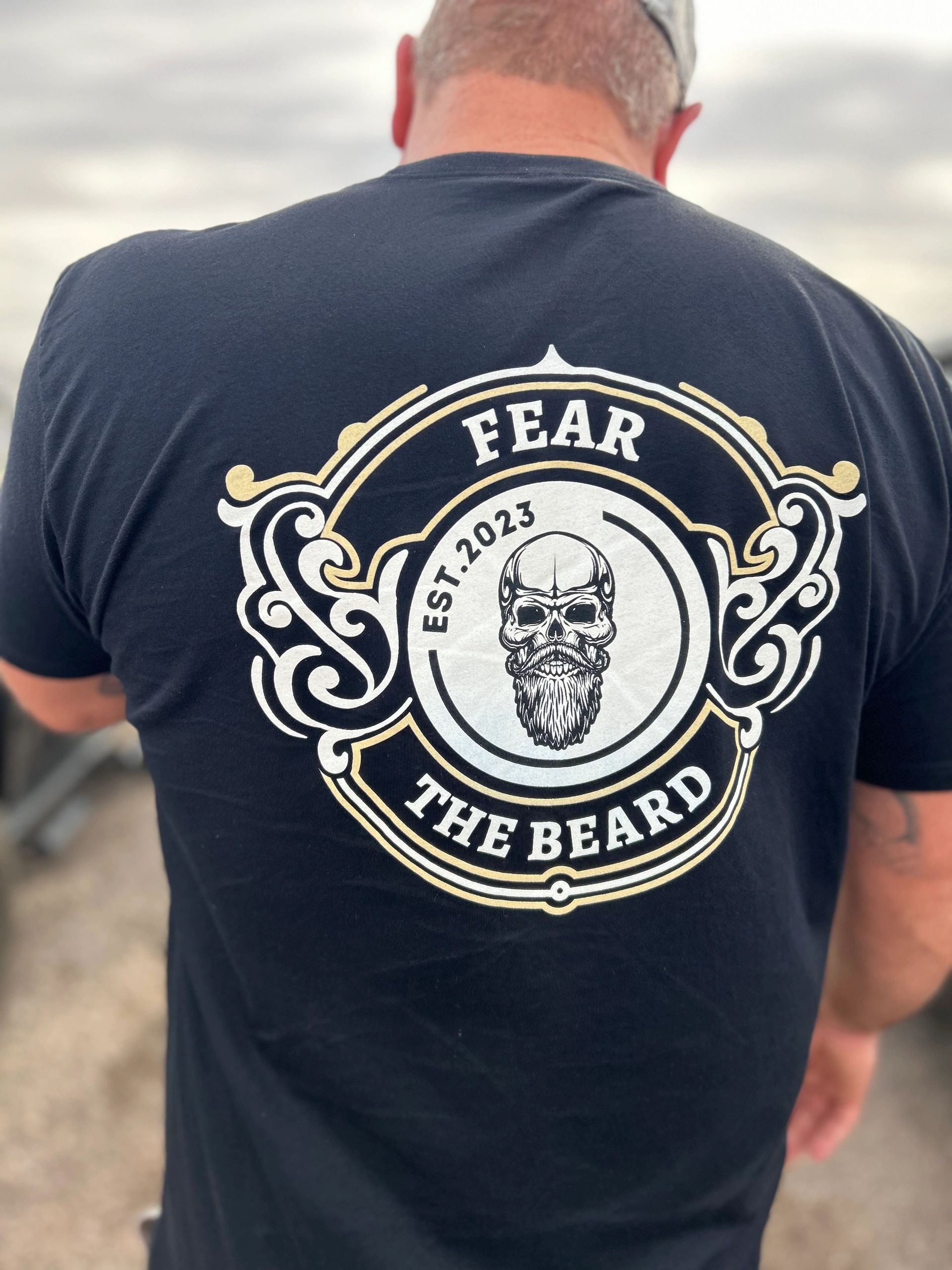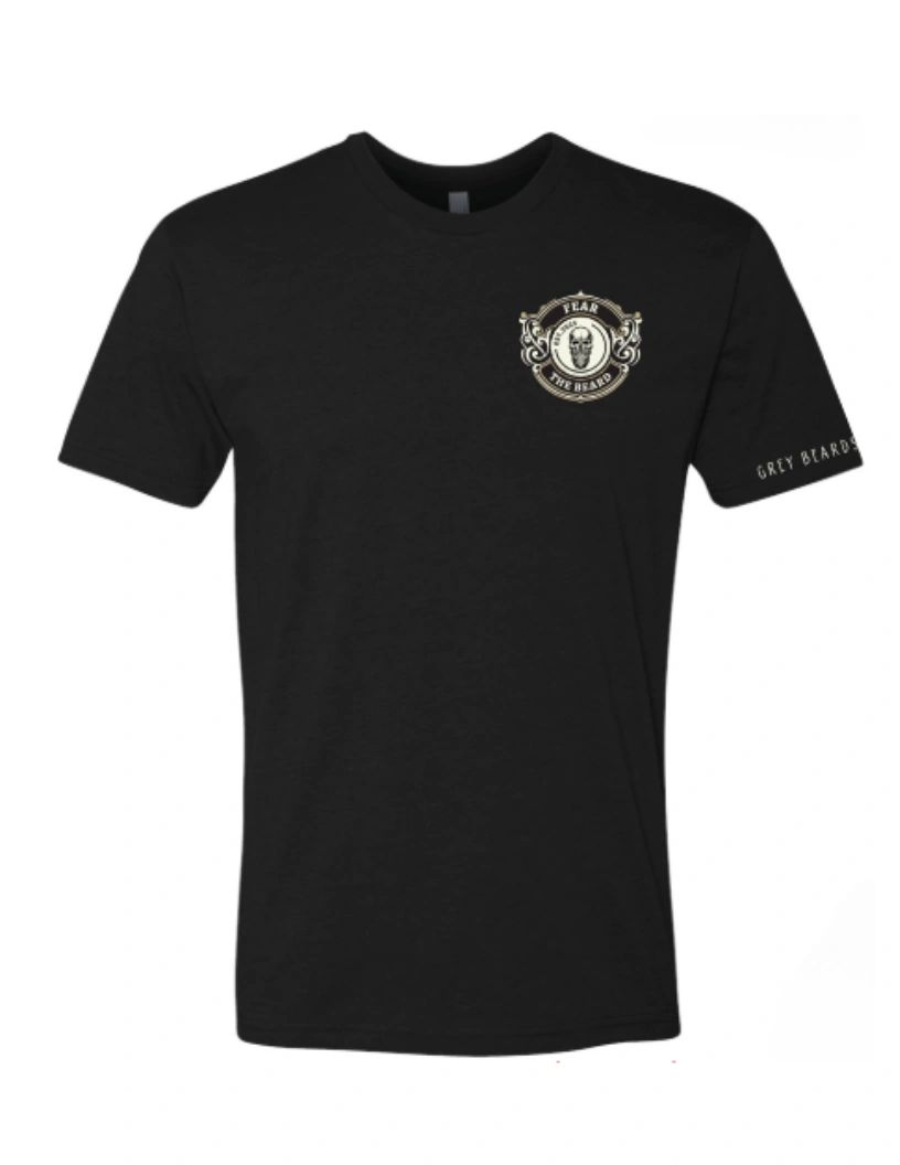 The Fear the Beard Rasta Tee is Grey Beards at its most refined. An ornate vintage-style crest sits on the front left chest — our bearded skull framed in gold filigree with the “Fear the Beard” banner. The sleeve carries the Grey Beards name so there’s no question who you represent. This black Next Level tee runs on a soft polyblend that breathes easy and fits right. For the grey beard who keeps it bold without saying a word.