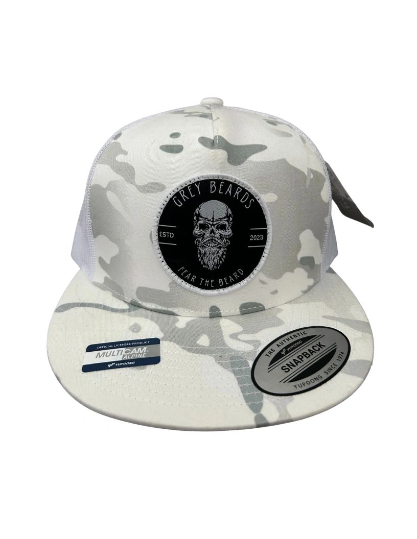 The Grey Beards White Camo Snapback stands out by blending in. Alpine white multicam pattern on a Yupoong classic flat bill with our round “Fear the Beard” skull patch stitched on front. This Grey Beards hat brings a tactical edge to the lineup — subtle camo pattern, bold branding, and a snapback closure that locks in the fit. For the grey beard who wants something different without losing the attitude.